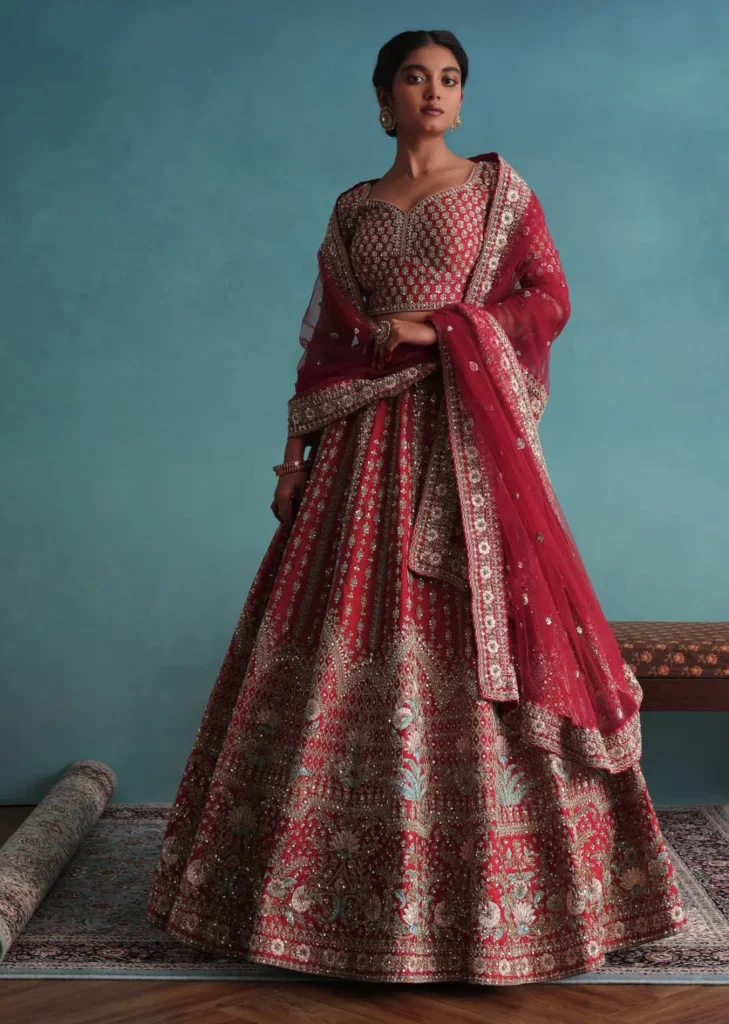 Instead of single-drape lehengas, brides were seen embracing hybrid saree-lehenga sets, belt-draped dupattas, and pre-draped sarees with dramatic can-cans—ideal for movement and dancing without compromising style.