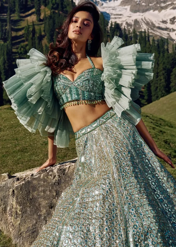 From one-shoulder blouses to corset-style cholis, the bridal blouse has become a statement piece of its own. Designers showcased structured bodices with mirror work, feather details, and even metallic boning to create bold silhouettes.