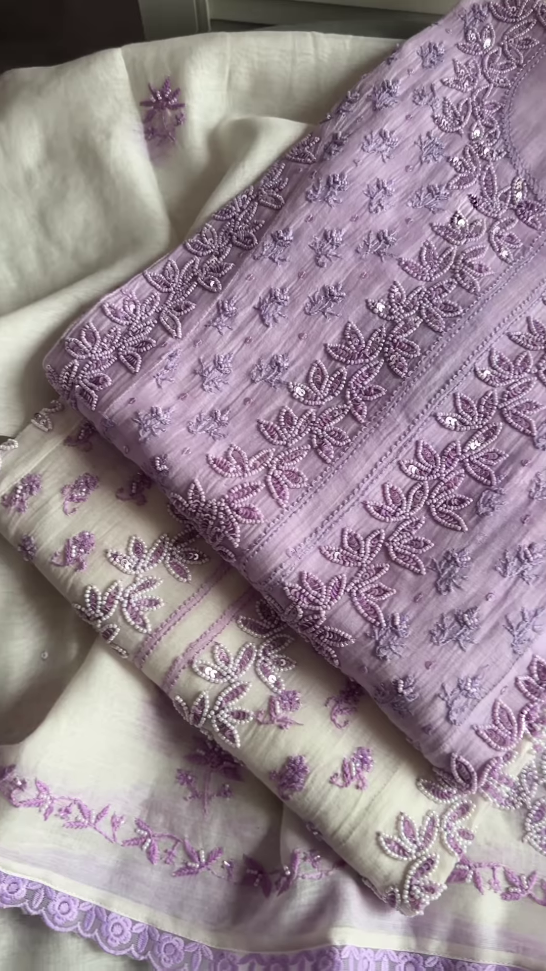 - A gorgeous lavender top fabric with rich floral embroidery and intricate thread work, designed to give you a premium look.