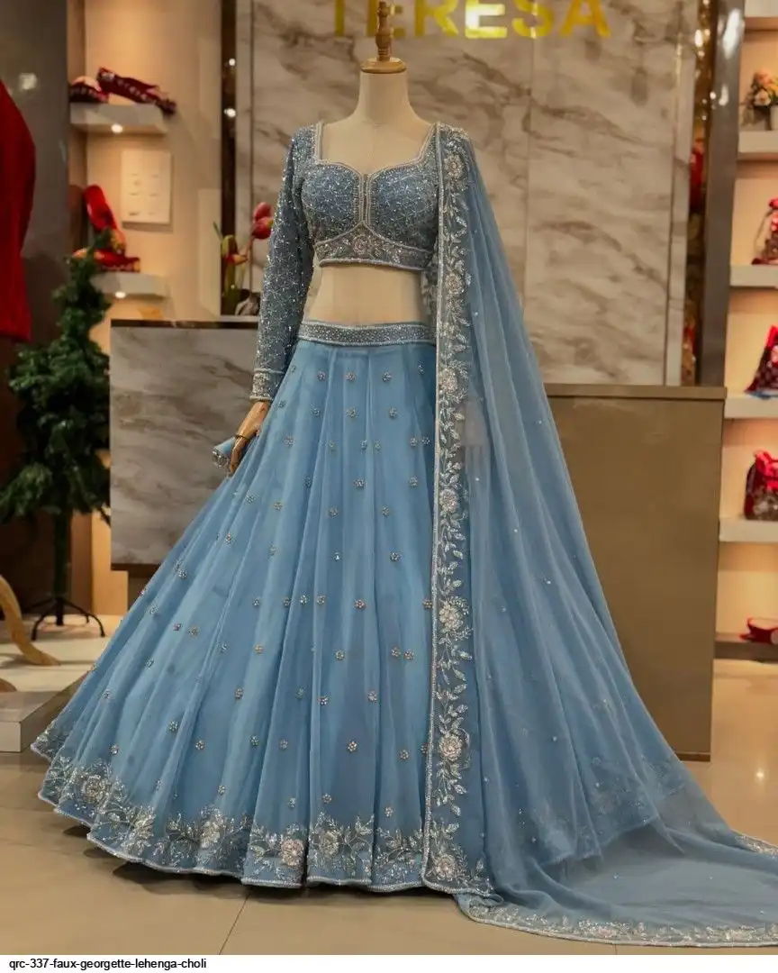 • A flowy net lehenga skirt, delicately studded with sequins and embroidery all over, complete with a broad embellished border that adds a regal touch.