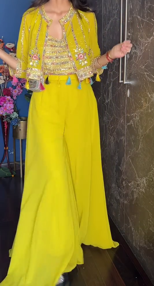 • Lehenga: Full flare with heavy mirror embroidery creating a stunning, reflective effect