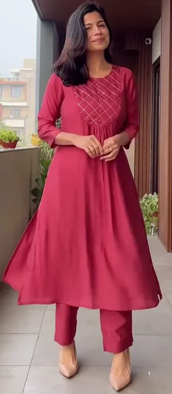 - Neckline: Round or V-neck with minimal embroidery or piping to complement the woven design