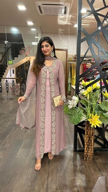 • Embroidery: Heavy threadwork, sequins, beads, and embellishments on the shrug that elevate the entire look