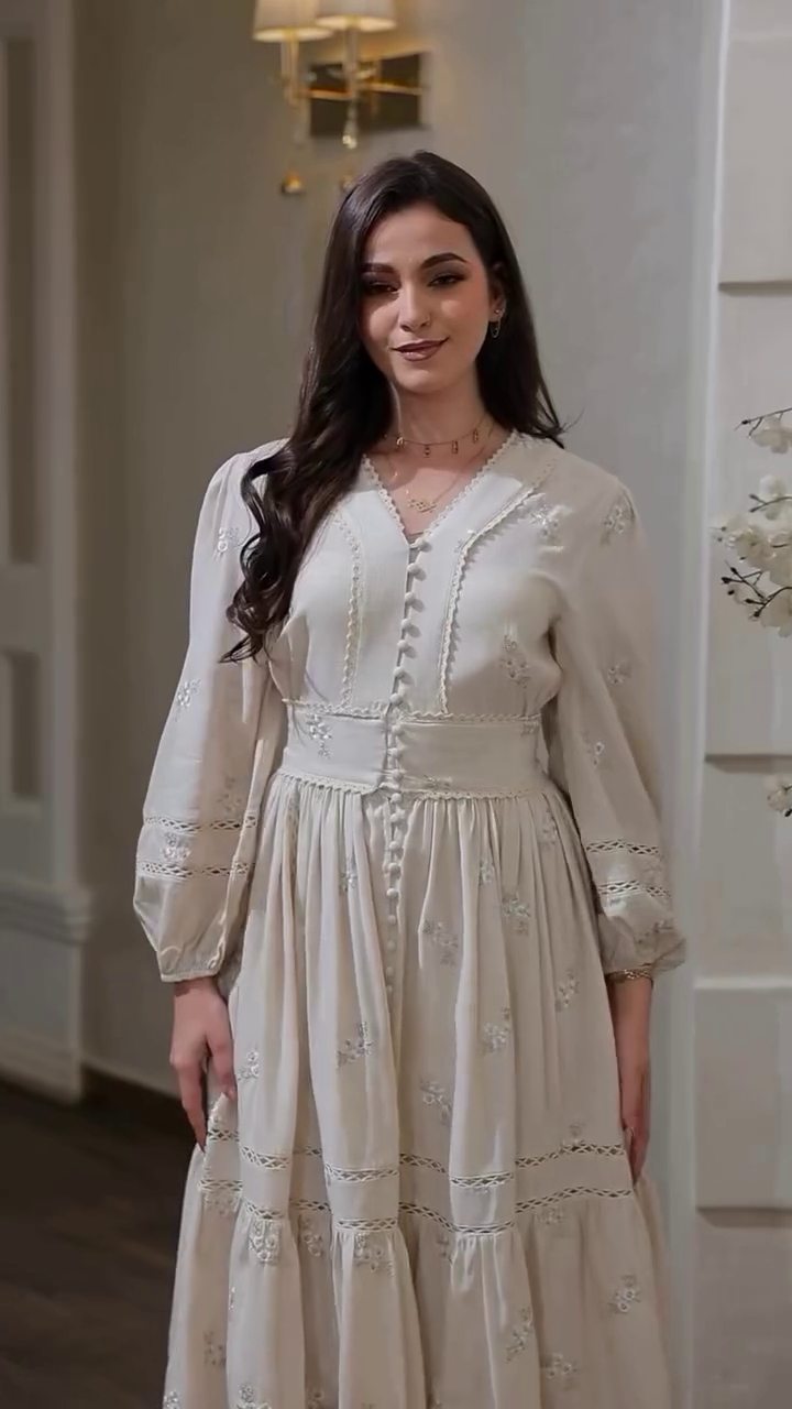 Step into timeless beauty with the Ethereal Elegance tiered floor-length dress in a soft ecru shade. This dress offers a blend of classic charm and modern flow, perfect for formal events, evening parties, or special occasions where grace and style are paramount.