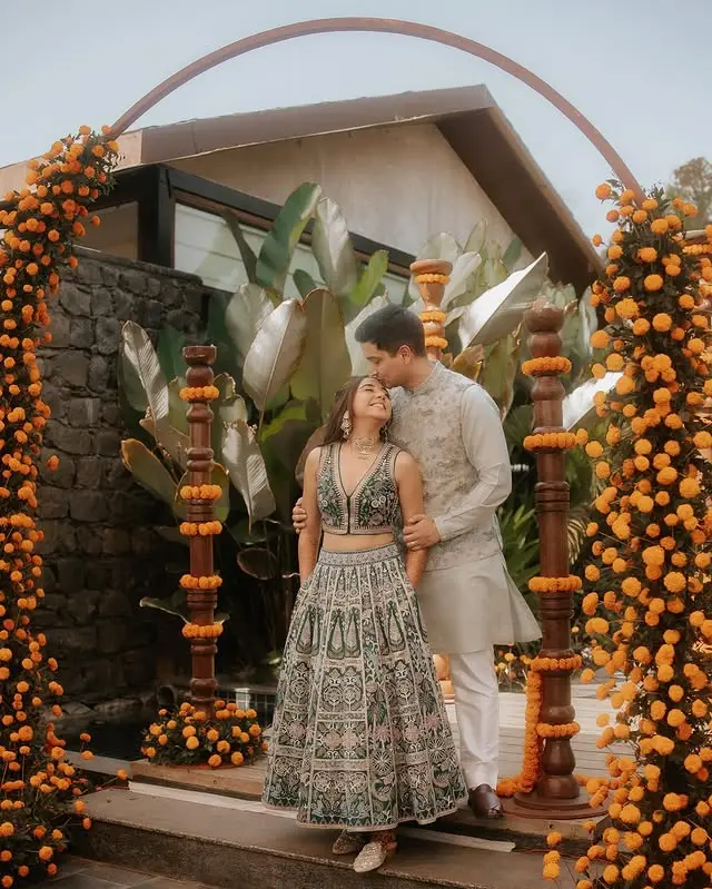 The wedding celebrations began with a vibrant mehendi ceremony held poolside. The theme for the occasion was earthy and organic, featuring orange marigold flowers, Ikat prints, clay pots, and a color scheme of orange, green, rust, and beige. Prajakta wore an emerald green ensemble by Anita Dongre, which mirrored the theme and her personality.