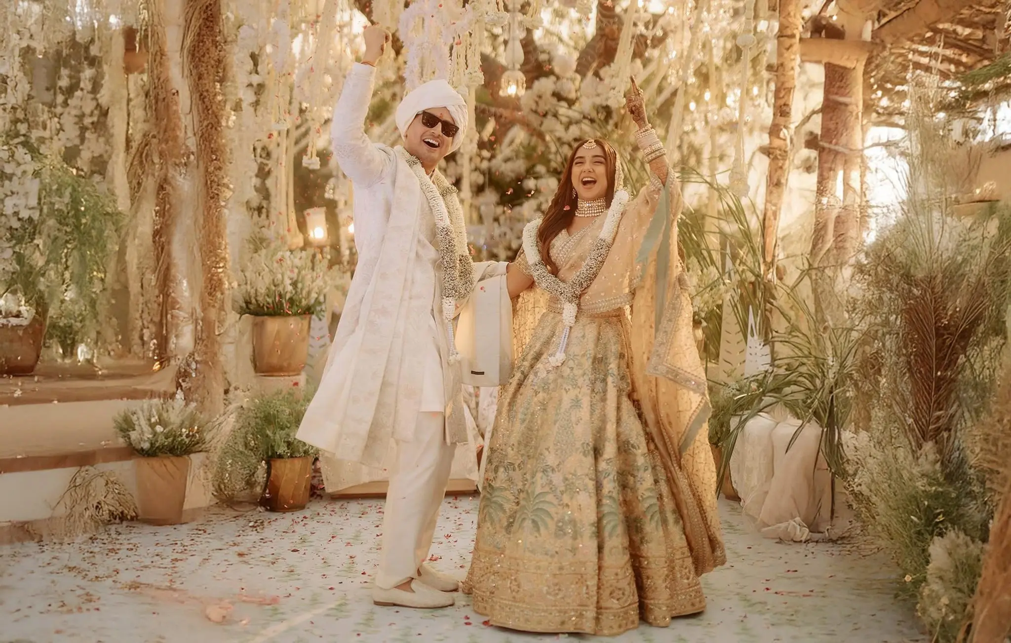 For their wedding ensembles, Prajakta and Vrishank collaborated with renowned designer Anita Dongre. Prajakta wore a custom-made lehenga featuring Parijat patterns and Pichwai paintings, hand-embroidered by artisans from the SEWA foundation. The lehenga’s intricate detailing and the inclusion of pockets added a modern touch to the traditional design. Vrishank complemented her look with an ivory sherwani, also designed by Anita Dongre, featuring delicate tone-on-tone embroidery that harmonized with Prajakta’s attire.
