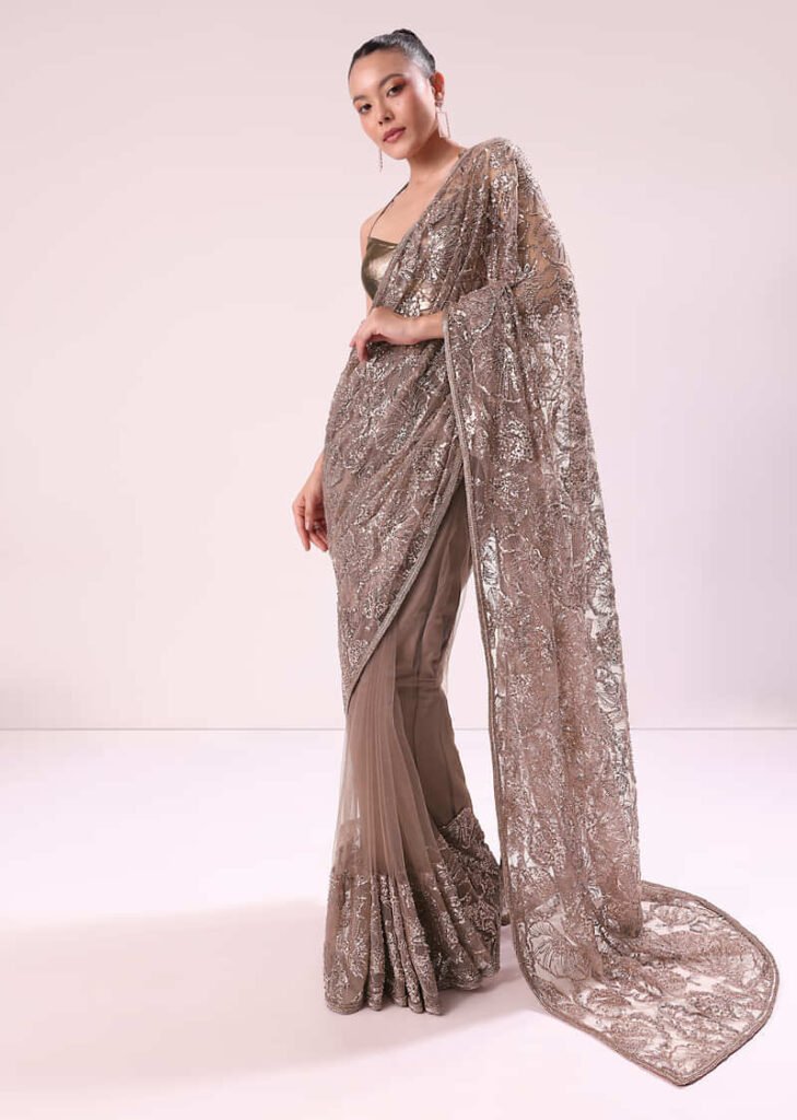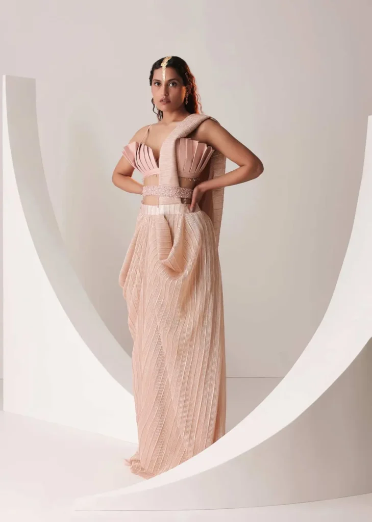 This modern drape features extremely thin, pleated pallus that show off the midriff and create a “butterfly wing” effect.
