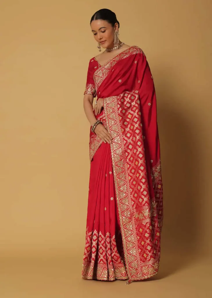 Here, the saree is pleated like a lehenga skirt, and the pallu is worn like a dupatta over the shoulder or across the chest.