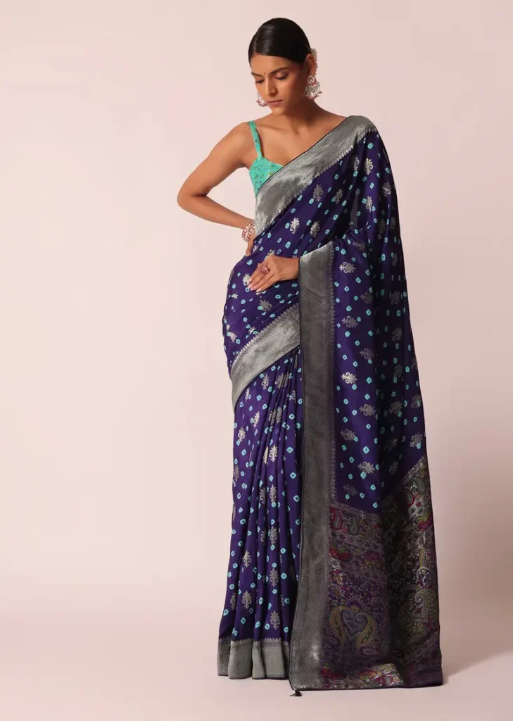 These sarees are made using the tie-dye technique, often in patterns of dots and waves. They’re a visual celebration of color and culture.