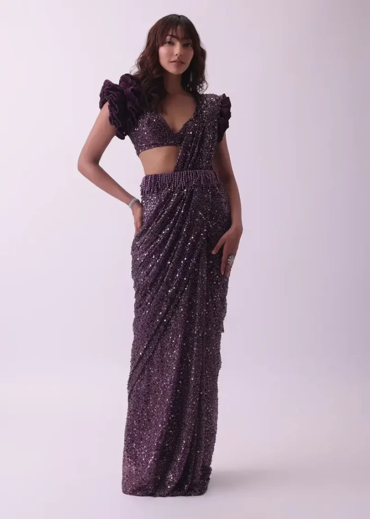 This fusion style adds edge and comfort. Think dhoti pants or palazzos replacing the petticoat, with the saree pleated sharply at the front or draped like a pallu around the shoulders.