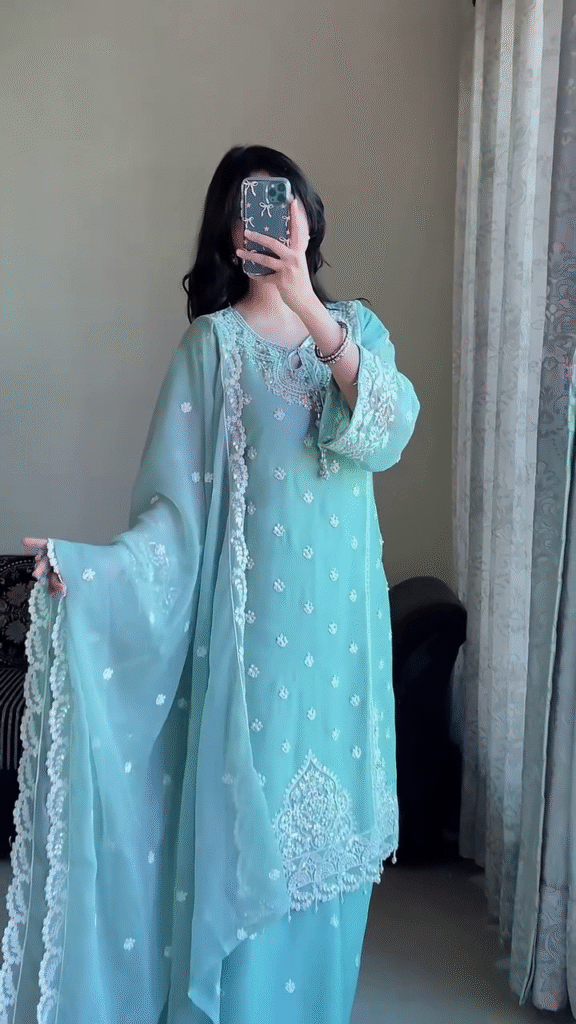 This aqua blue embroidered set is a closet essential for every woman who loves ethnic wear with a soft, serene vibe. It’s chic, graceful, and made to make you shine—effortlessly.
